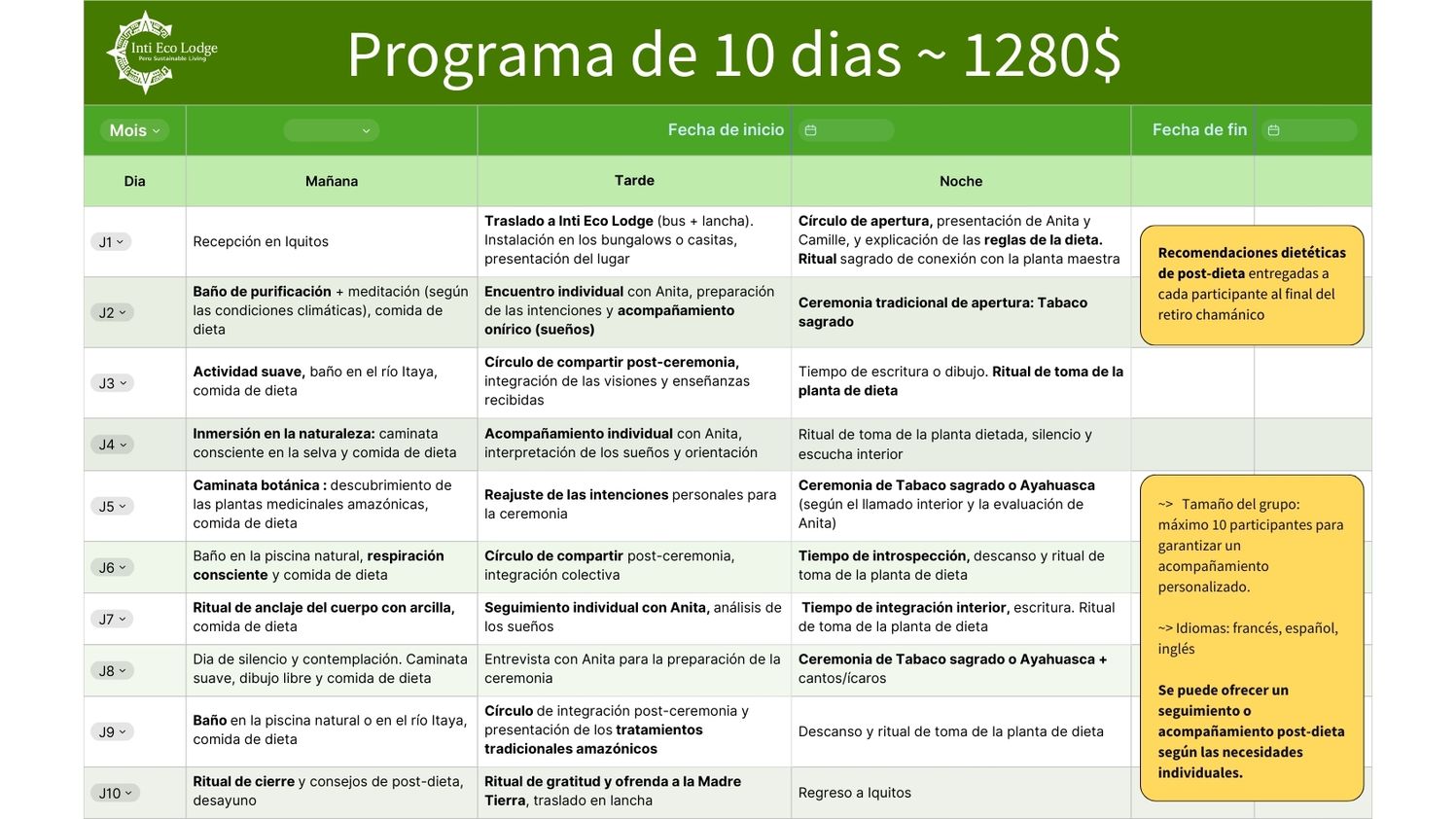 EXCELLENT Basée sur 34 avis Publié sur blandine beletTrustindex vérifie que la source originale de l'avis est Google. Une très belle expérience cette participation à une cérémonie du tabac ! Merci beaucoup pour l'accueil chaleureux, les explications, les moments partagés, les discussions... nous nous reverrons 😉Publié sur nathalie masoniTrustindex vérifie que la source originale de l'avis est Google. J ai fait ma première cérémonie du tabac sacré, en France avec Anne et Camille, le we du 15 novembre. Une expérience forte ! Très bien accompagnée, dans un cadre rassurant, bienveillant et en totale confiance. On apprend sur soi, par les autres, on soigne nos maux, on découvre des pistes de recherche, c est incroyable et tellement bénéfique. Merci les Maestras ! NathaliePublié sur nicolas bouTrustindex vérifie que la source originale de l'avis est Google. Je suis resté six semaines à Inti, j'étais volontaire durant les quatres premieres semaine, j'ai fait une diète la cinquième et redevenu volontaire la sixième. Côté volontariat le travail du moment était de prendre soin des arbres fruitiers et le nettoyage des extérieurs des bâtiments, j'ai aussi aidé les travailleurs locaux sur le site. Côté spirituel Anne est très à l'écoute et répond a toute nos questions avant les cérémonies. Je me suis senti totalement en confiance avec Anne, j'ai effectué quatre cérémonie de tabac une diète et deux d'ayawaska. La diète a juste été exceptionnelle et m'a fait comprendre énormément sur moi même. Les cérémonies du tabac on été très libératrice sur le plan physique, les deux d'ayawaska ont répondu aux intentions que j'avais poser. Bilan : si vous voulez profitez d'un lieu calme à un prix abordable devenez volontaire, si vous voulez élevez votre côté spirituel (et non prendre l'ayahuaska comme un trip) c'est le lieu idéal avec une Shamane de confiance. Merci a toi Anita pour ces belles énergies, a bientôt j'espèrePublié sur Eloise JouhetTrustindex vérifie que la source originale de l'avis est Google. Merci Anita d'avoir cru et monté ce projet d'ecolodge et de conservation de la biodiversité. L'endroit est magnifique, et il n'y a pas de mots pour décrire ce que c'est que de dormir entourée des bruits de la jungle. Les logements pour couple sont géniaux : un grand lit avec moustiquaire, une table pour se poser, une belle douche et toilettes carrelées. Et une vue sur le vert puissant de la jungle. Les repas sont communautaires et végétariens, partage et bonne humeur au rendez vous. Il y a toute sorte d'activité : aller se baigner dans le Rio, aller se promener sur les sentiers du terrain, pêcher à la tombée du jour, canoë, volley, parties de football endiablées le dimanche au village de San martin (30 min à pied) Aussi, vous pouvez vite passer des heures entières à seulement contempler la diversité des oiseaux ! Il y a un point wifi disponible mais la magie de la jungle opère mieux lorsqu'on accepte la déconnexion. Enfin, Anita est une curandera de confiance, qui a une approche des plantes purement médicinale, et elle prend vraiment le temps de vous aider à clarifier ce que vous venez chercher au travers de la médecine des plantes, et de faire un suivi après cérémonie, et pendant les dietes si diete il y a . Bref, un temps d'introspection de qualité, merci pour tout !Publié sur Celie CadelTrustindex vérifie que la source originale de l'avis est Google. Inti éco lodge à été pour moi une expérience hors du commun, une expérience rare que nous ne nous accordons que peu de fois dans notre vie. Un lieu où j’ai pu être accompagnée en tant que patiente durant 3 semaines. Atteinte de la maladie de Lyme, je cherchais depuis des années des alternatives à la médecine classique, chacune me soulageant et me libérant un temps mais jamais profondément. J’avais eu la chance de pouvoir faire quelques expériences chamaniques en France mais celle ci a changé ma vie. Inti est un espace unique, dédié à la médecine par les plantes, à la libération et à la guérison de soi. Situé au milieu de la foret amazonienne, cet espace est accessible après 2h de bus depuis Iquitos, puis 2h de bateau. Les retraites proposées sont constituées de cérémonies chamaniques, diète, prise de plantes, temps d’introspection et accompagnements personnalisés avec Anne, chamane et Camille, herboriste. Anne et Camille sont des personnes complémentaires qui apportent elles-deux un grand soutien tout au long de l’accompagnement. Anne aide précieusement à interpréter les rêves, à décrypter les messages reçus et à approfondir les réflexions, guidant ainsi la quête de soi-même. Chaque unité a son importance, son énergie et son rôle à jouer, dans cet espace où nous sommes acteur de changement. La présence des travailleurs et des bénévoles à toute leur importance aussi et apporte convivialité au lieu. Cette retraite chamanique à été pour moi libératrice, réparatrice, au-delà de toute espérance. Là où je cherchais des réponses à mes questions, des guérisons sur les plans physiques, émotionnels, psychiques, depuis des années, j’ai découvert la puissance de la médecine par les plantes et de l’accompagnement chamanique ; un soin holistique qui réuni tout en un même espace. C’est grâce à cette harmonie et cette symbiose que j’ai pu me libérer de nombreux maux qui rongeaient ma vie et ma santé. La médecine par les plantes reste une discipline et un lieu de rigueur, non anodin. C’est un chemin profond vers la compréhension et la libération de soi, avec le soutien des plantes et des soins chamaniques. Merci à Anne, à Camille et à toutes les personnes qui m’ont permis d’aller au bout de ce beau voyage introspectif.Publié sur Christophe JovignotTrustindex vérifie que la source originale de l'avis est Google. J'ai passé deux semaines incroyables à Inti Eco Lodge avec ma 